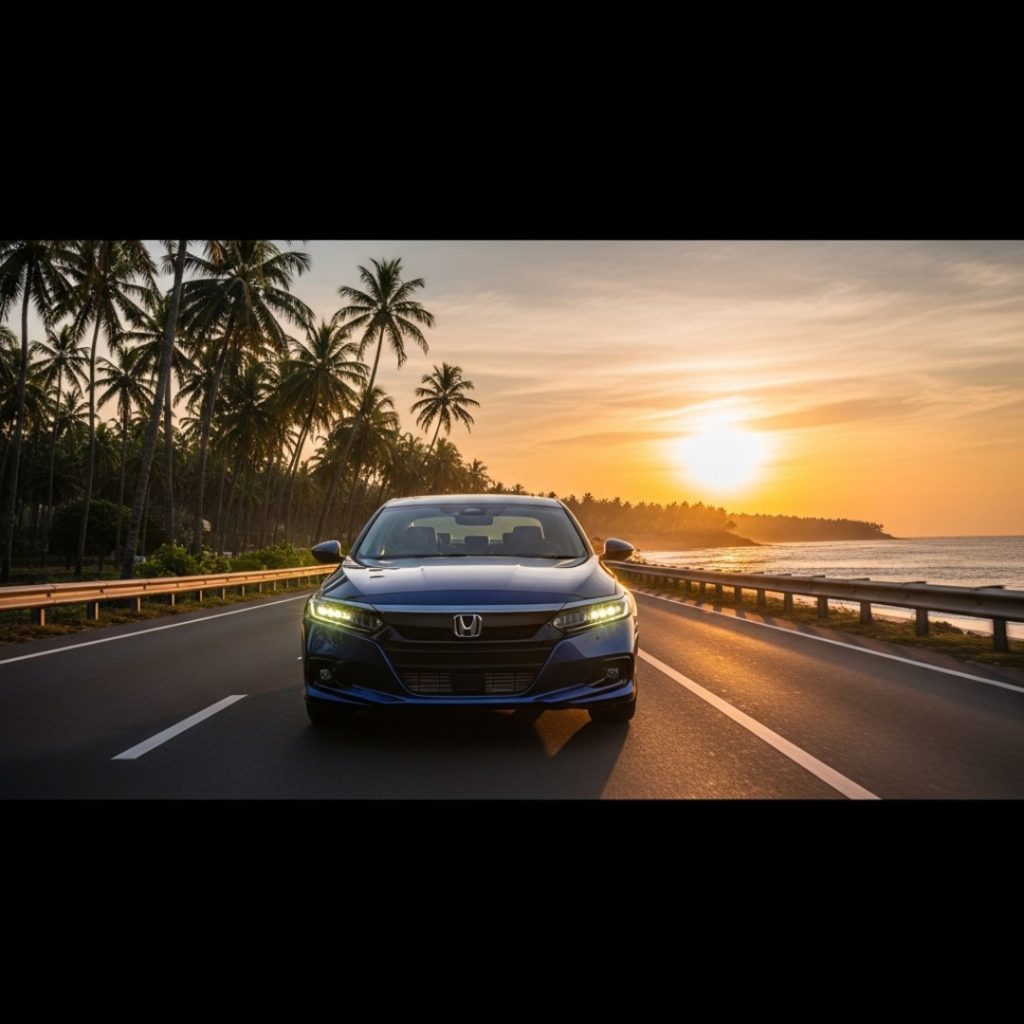 Honda Accord Hybrid being driven on a scenic Indian coastal highway