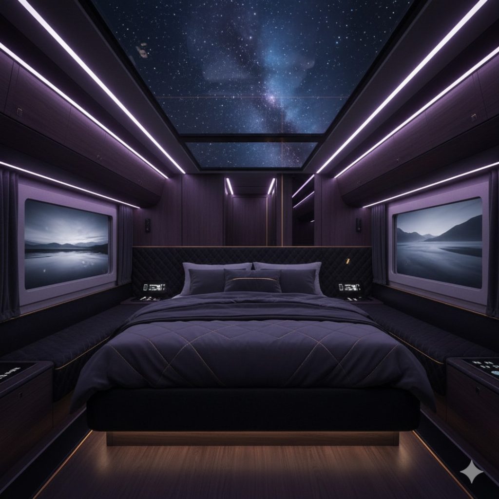 - The Upper Deck (The Master Suite): A staircase leads to a king-size bedroom with a glass panoramic roof that can be dimmed electronically.