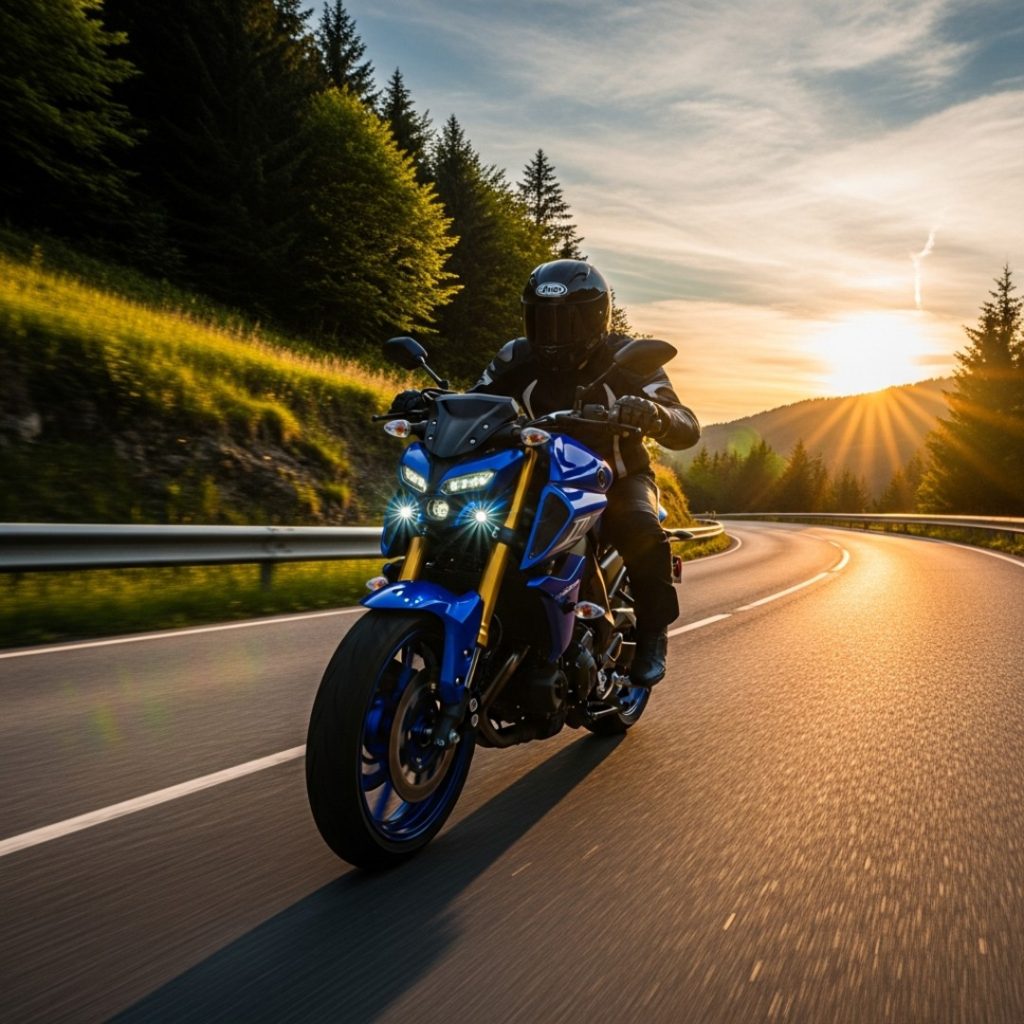 Yamaha FZ-S V4 in ‘Racing Blue’ being driven on a scenic winding road at sunset.